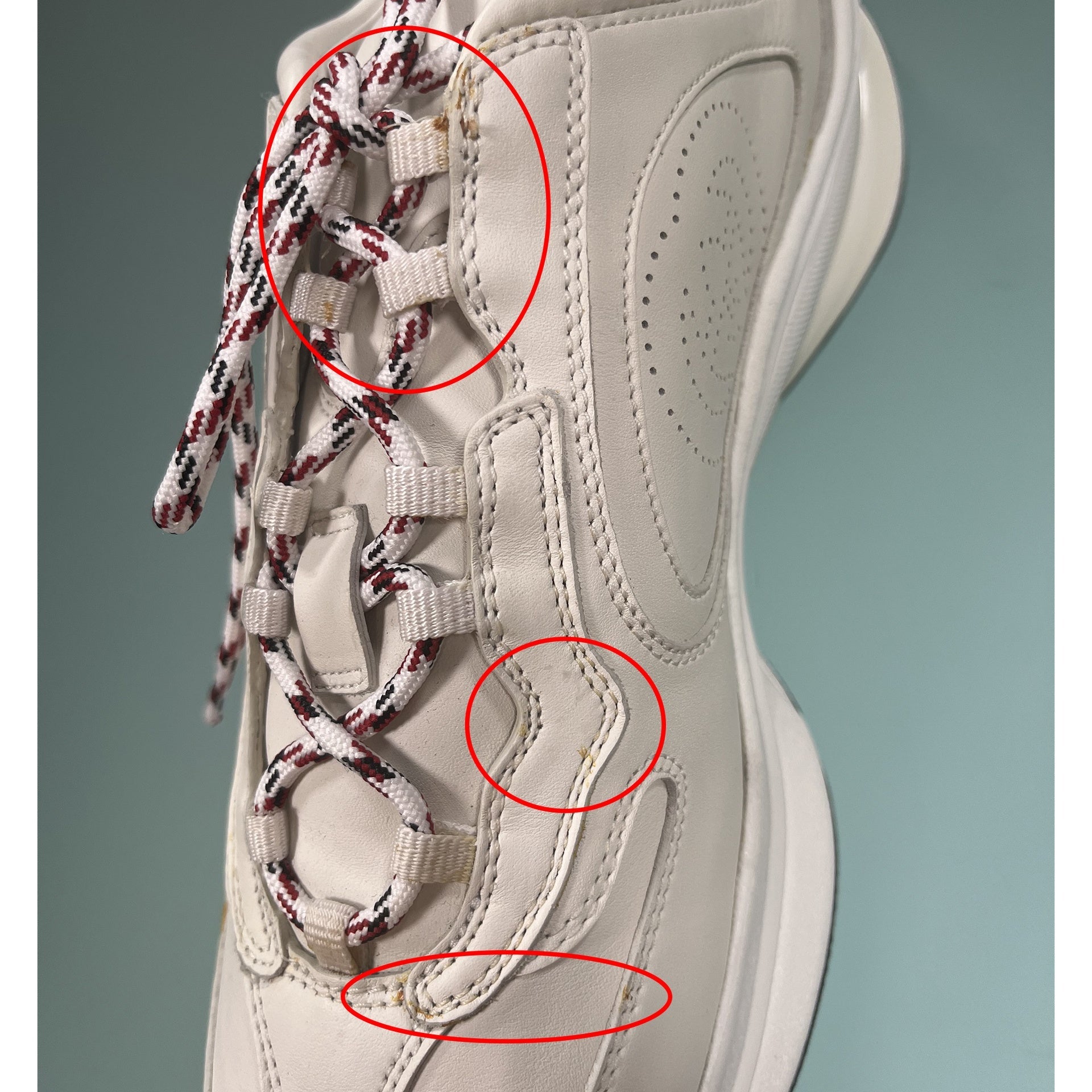 - Imperfections: yellow glue spots on the right shoe